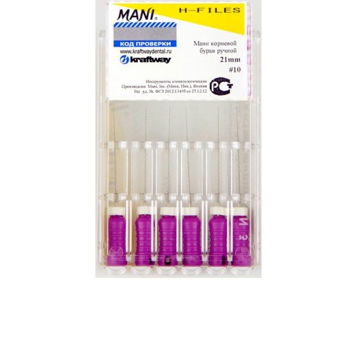 Н-файл № 10 Mani применяется в эндодонтической стоматологии для лечения сложных случаев кариеса. С его помощью производится расширение и формовка зубного канала, что позволяет продолжить его лечение или произвести пломбирование.